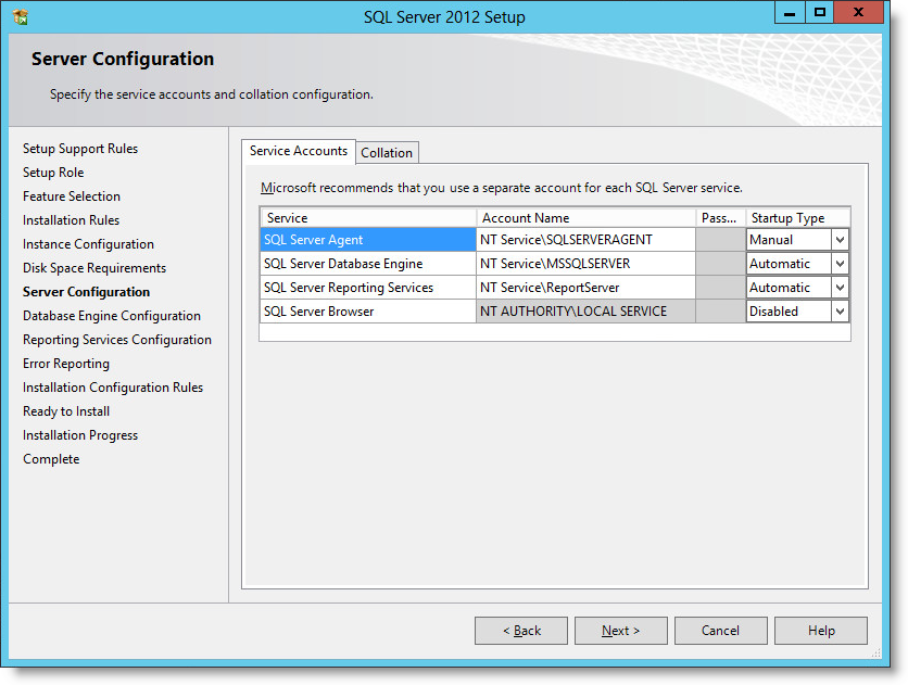 12 - Specify the service accounts and collation configuration, here I set NT AUTHORITY\System for: