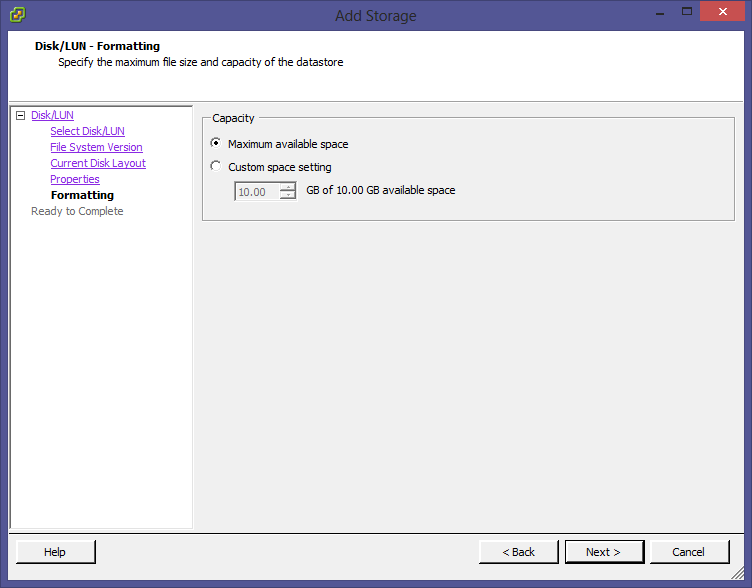 7 - Specify the maximum file size and capacity of the datastore. Here select the Maximum available space. click Next.
