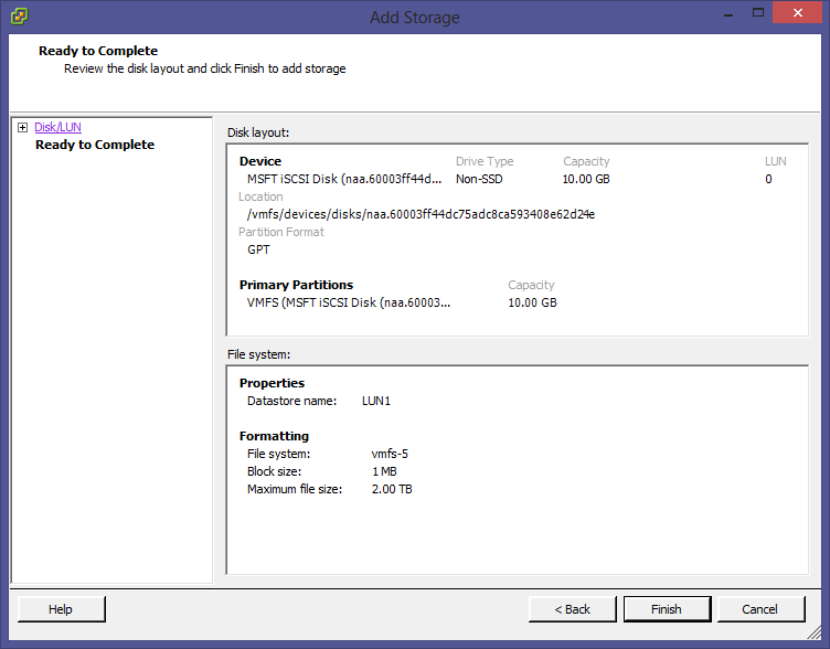 8 - Final step, review the disk layout and click Finish to end the Add Storage wizard.