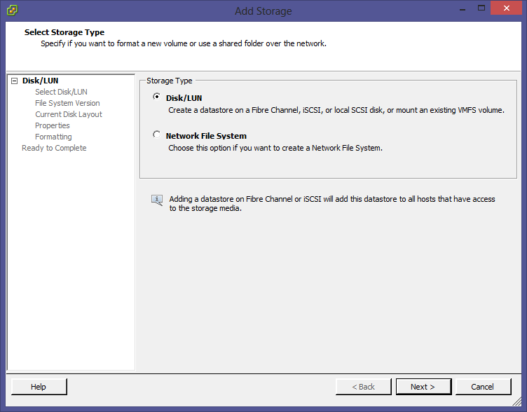 2 - In the Add Storage Wizard, select Disk/Lun and click Next