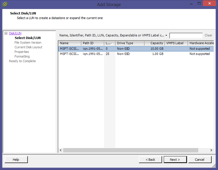 3 - Select a Disk/LUN to create a datastore, here I select my 10GB lun. Click Next.