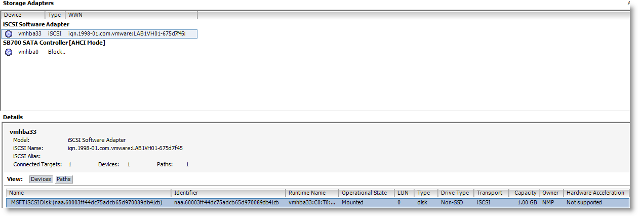 | Once added, you'll see the iSCSI Software Adapter with the iSCSI IQN of this server |