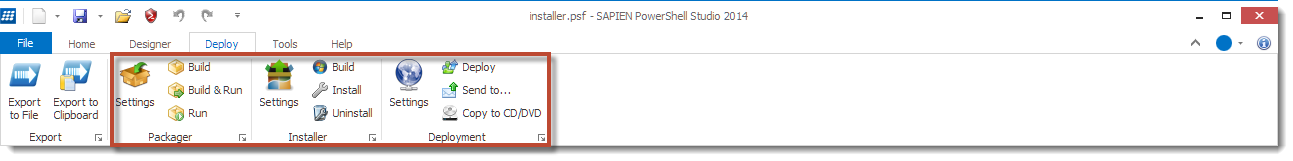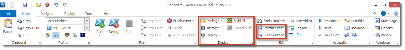 RIBBON UI Home tabNew Abilities to Create a Package, an Installer, a Deployment or an Executable file in the Deploy section. New Tools: Format Script and Build Function (see below for more details)